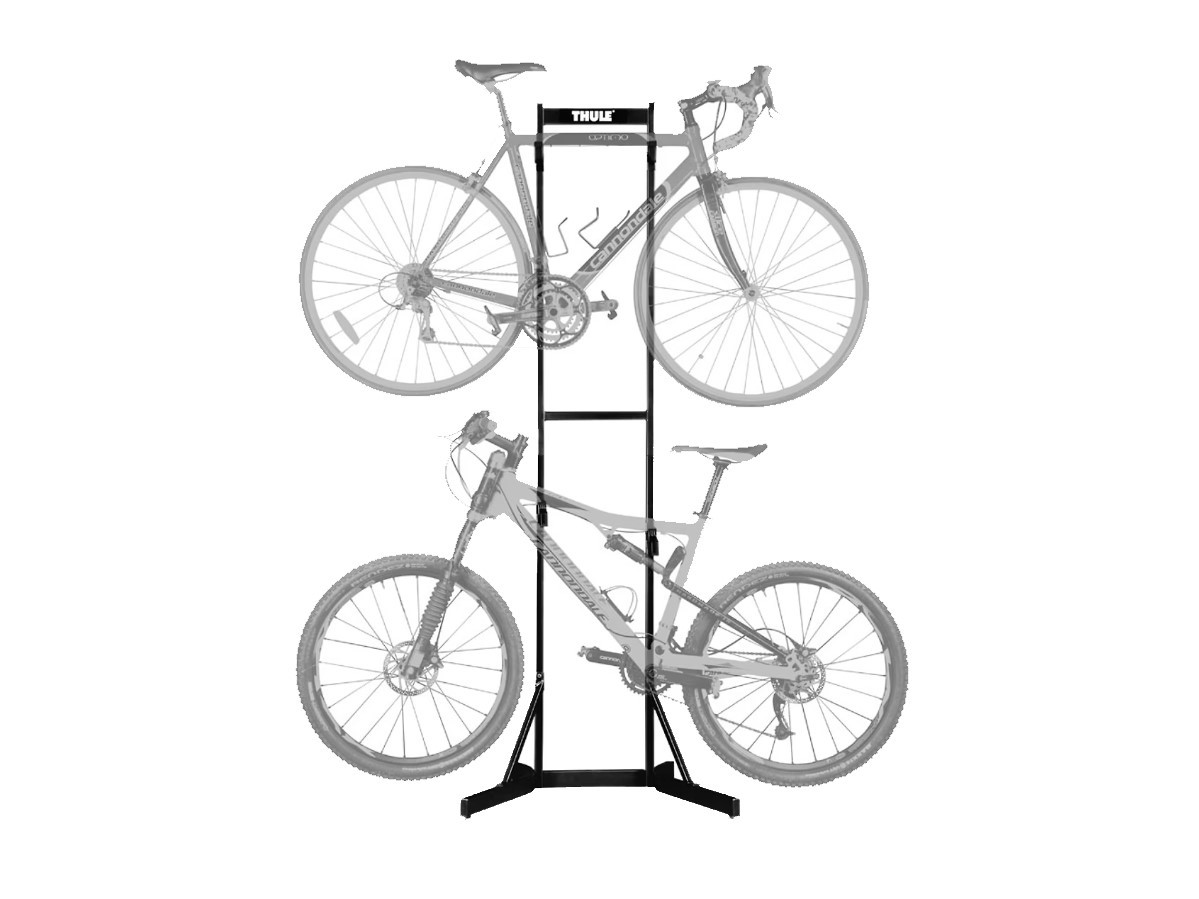 Samostatne stojaci stojan na bicykle Thule Bike Stacker 578101. Pojme až 2 bicykle, ktoré sú uchytené v plastovom džiaku, nehrozí tak ich poškriabaniu. Výšku ramien držiaka môžete ľubovoľne nastaviť. Stojan má nosnosť 70kg, pojme tak aj veľké a robustné kolesá.