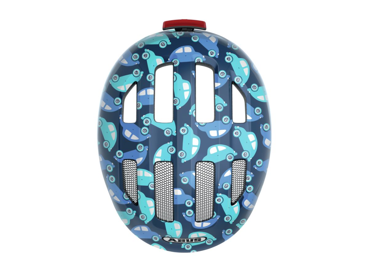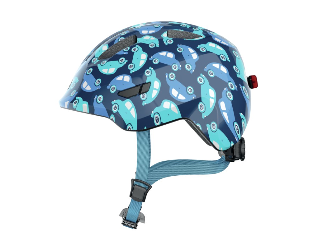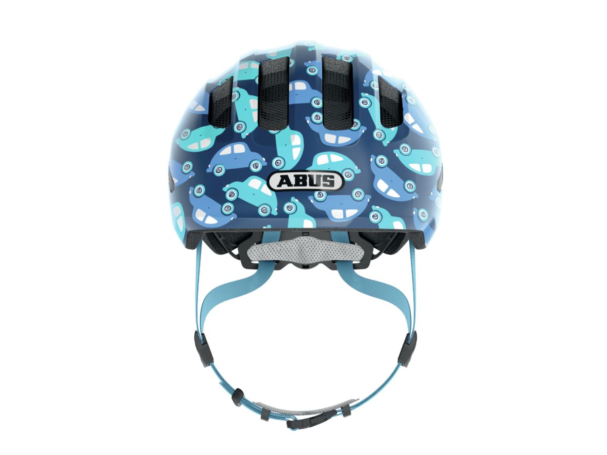Bezpečná a kvalitná detská prilba s motívom modrých autíčok, Abus Smiley 3.0.