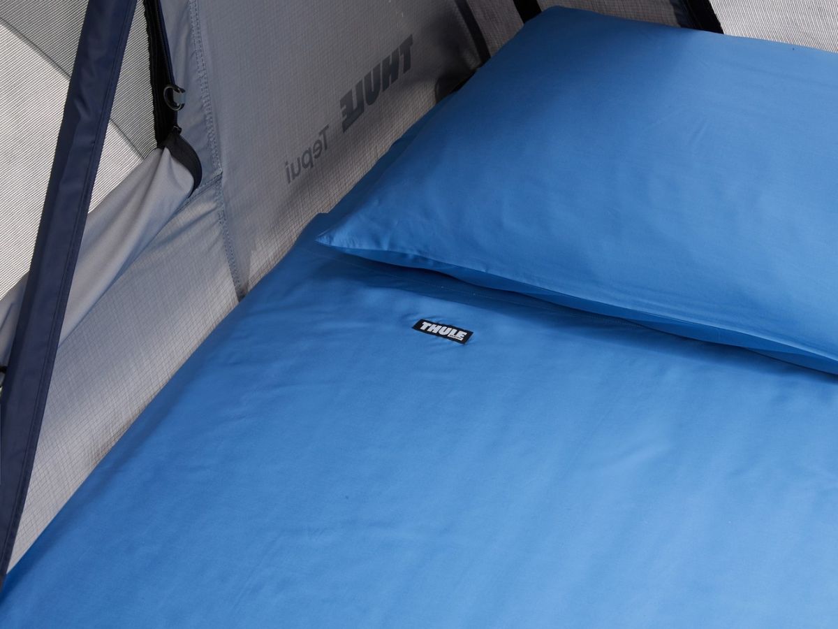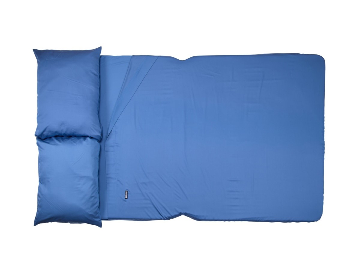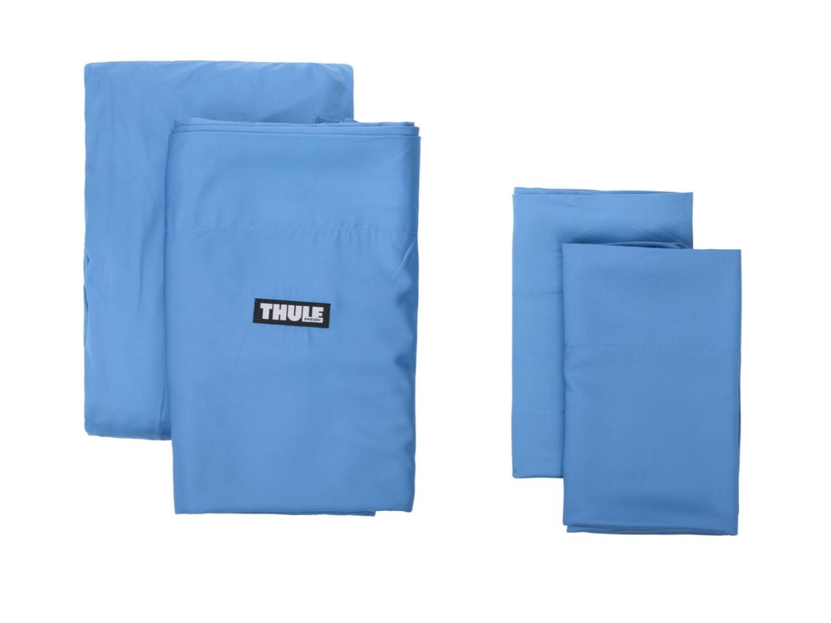 Lôžkoviny pre autostan Thule Basin/Basin Wedge. Obsahuje jedno prestieradlo, dva poťahy na vankúše a jeden presne padnúci poťah na matrac o rozmere 122cm x 213cm, všetko v modrej farbe.