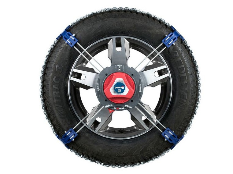 Montáž je jednoduchá a rýchla, reťaz sa pripevňuje priamo na originálnu matku kolesa. Reťaz navlečiete na pneumatiku, upevníte na hlavu skrutky a utiahnete pomocou pewag servo račne - systém je vybavený ukazovateľom optimálneho utiahnutia. Všetky úkony sú vykonávané z vonkajšej časti pneumatiky. Nemusíte sa báť poškriabania ráfika, celý systém je konštruovaný tak, aby reťaz doliehala len na pneumatiku.