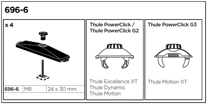 Nepasujú Vám rýchloupínacie klieštiny boxu Thule na Váš strešný nosič? Používate hliníkové priečniky s T-drážkou. Ideálnym riešením, ako box pripevniť k strešnému nosiču je upínacia sada Thule 696-6. Táto sada je vhodná pre všetky modely Thule Motion, Touring, Dynamic a Excellence.