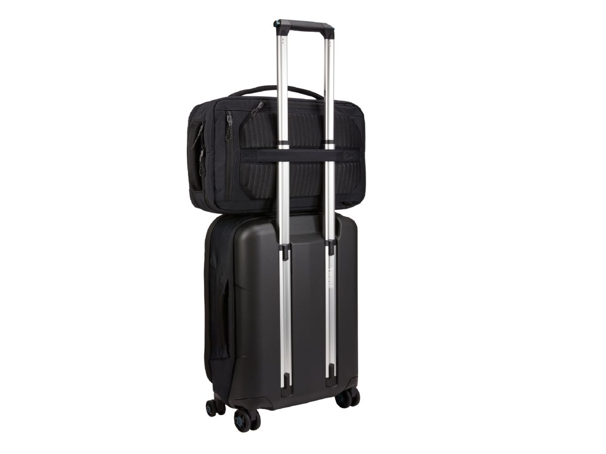Ako iné tašky/batohy od značky Thule, obsahuje aj táto popruh, pre bezpečné prirobenie k teleskopickej rukoväte batožinu na kolieskach, pre pohodlie počas cestovania.