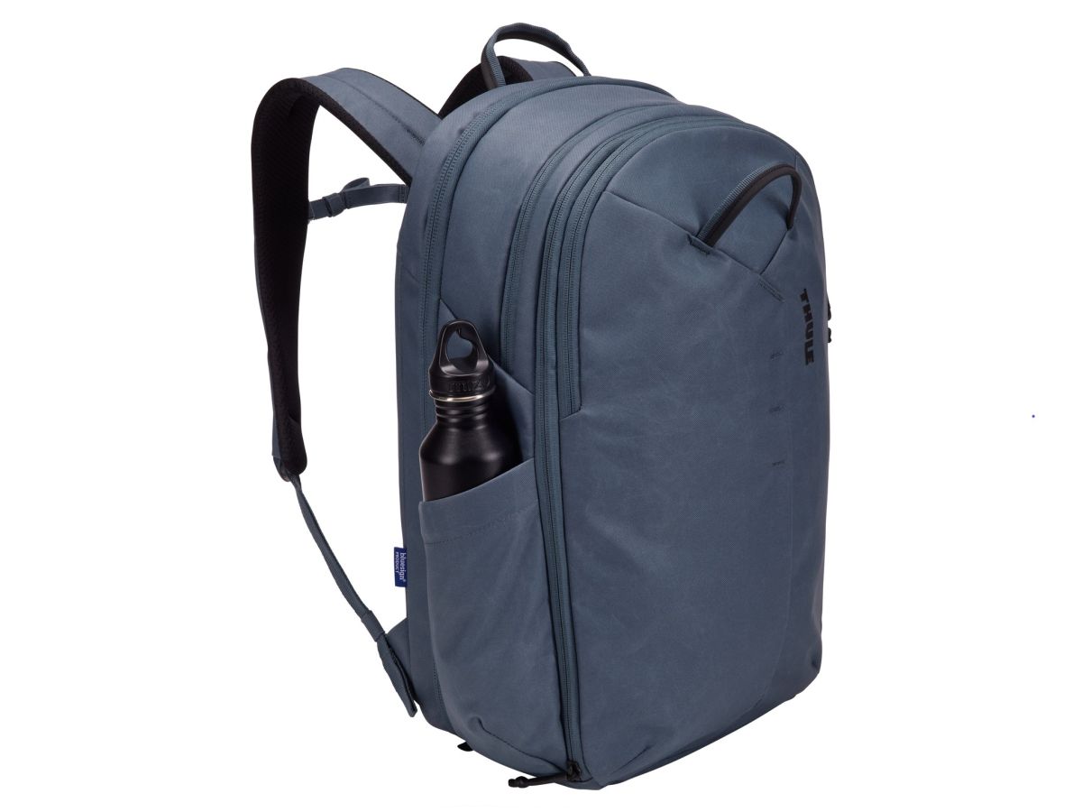 Textílie vonkajšieho plášťa, výstelka aj sieťovina sú vyrobené zo 100% recyklovaného polyesteru z recyklovaných plastových fliaš a batoh Thule Aion má certifikáciu buesign®. Vonkajšia tkanina je voskovaného plátna 600D, je veľmi odolná a obsahuje vodeodolnú povrchovú úpravu bez toxických PFC, ktorá odpudzuje vlhkosť, špinu a škvrny.