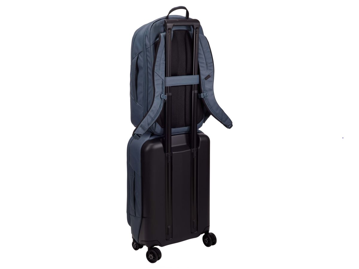 V chrbtovej časti je integrovaný pás, pomocou ktorého môžete batoh zavesiť na teleskopickú rukoväť inej batožiny.