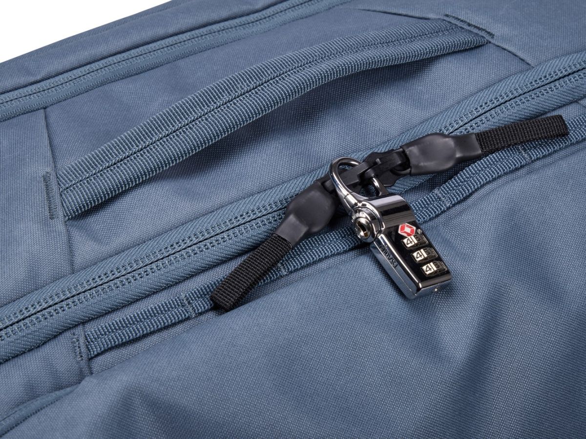 V chrbtovej časti je integrovaný pás, pomocou ktorého môžete batoh zavesiť na teleskopickú rukoväť inej batožiny.