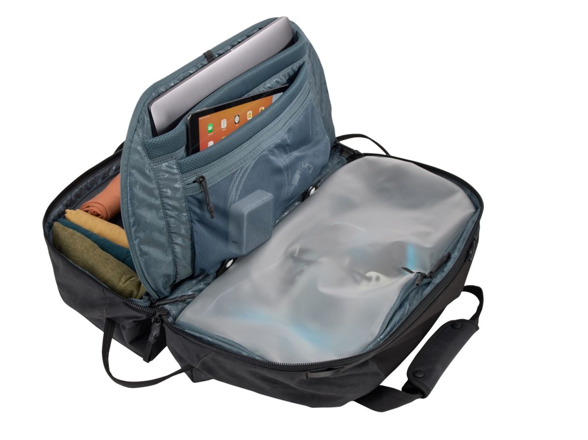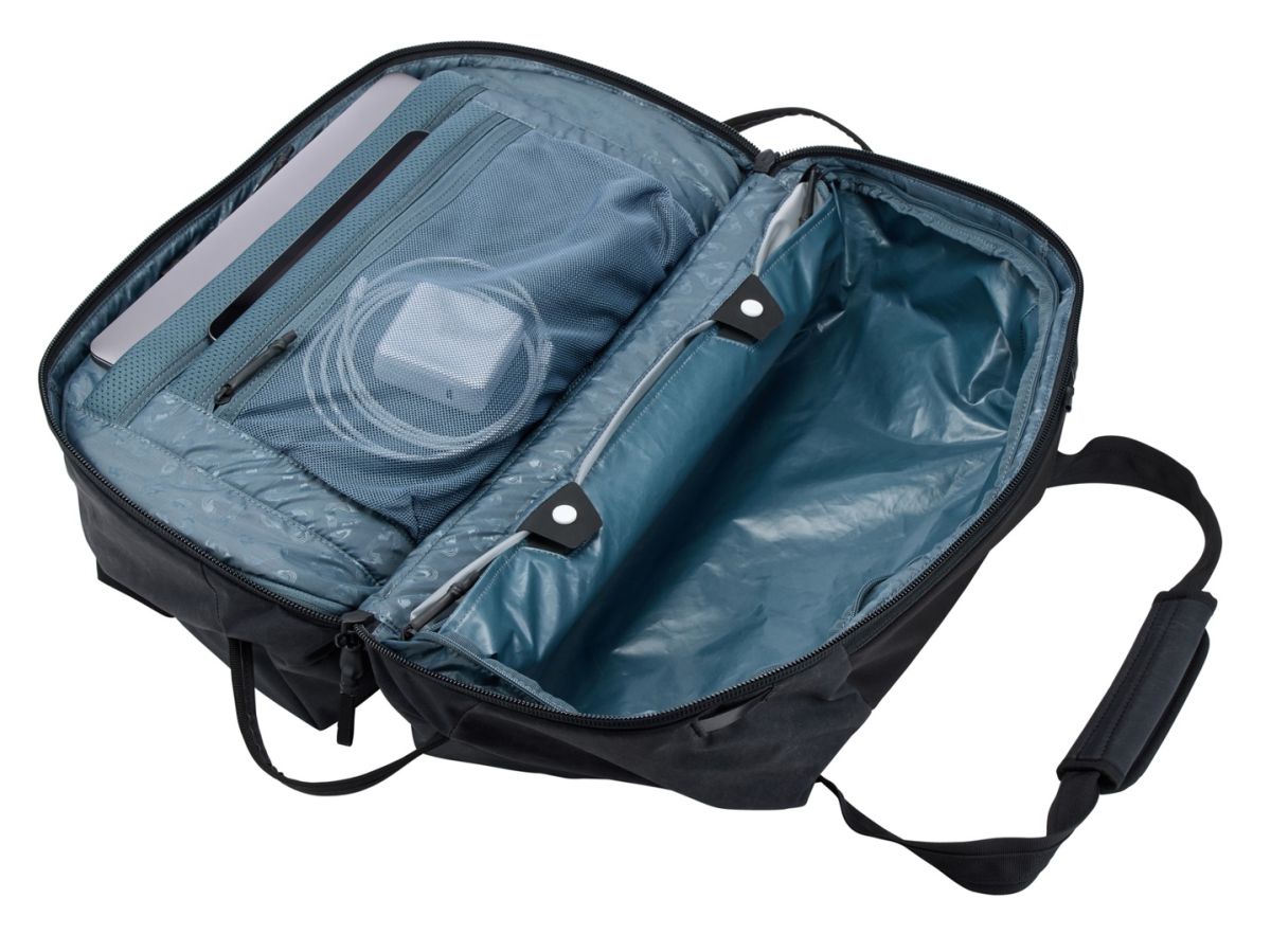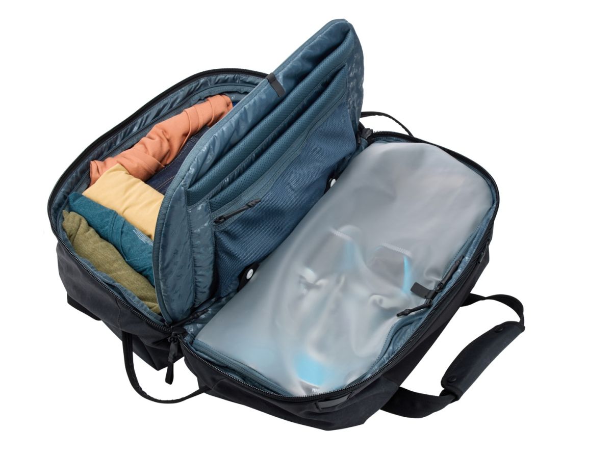 Viacúčelová taška Thule Aion s prepážkou z TPU ktorá zabraňuje šíreniu zápachu a nečistôt, tá vám umožní oddeliť špinavé predmety od zvyšku vybavenia. Túto prepážku je možné zložiť a uložiť v spodnej časti tašky.