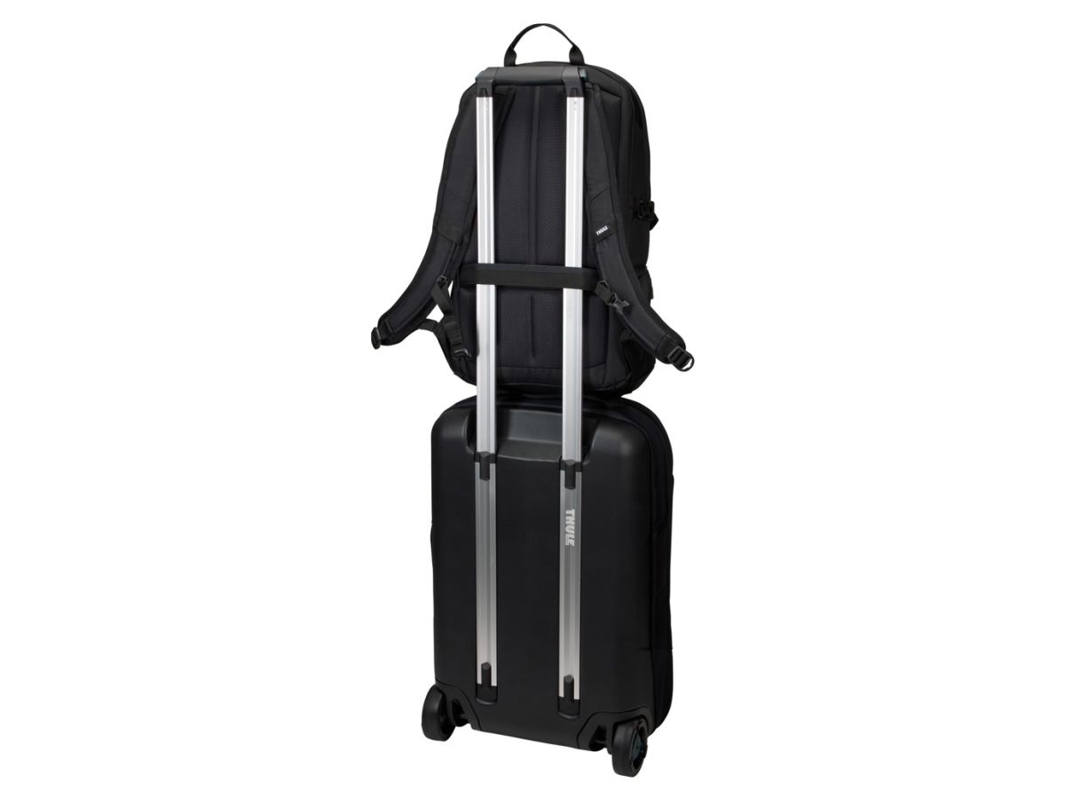Batoh Thule EnRoute je vybaven popruhem, díky kterému je možné ho nasadit na rukojeť jiného zavazadla a usnadnit si tak přesuny při cestování.