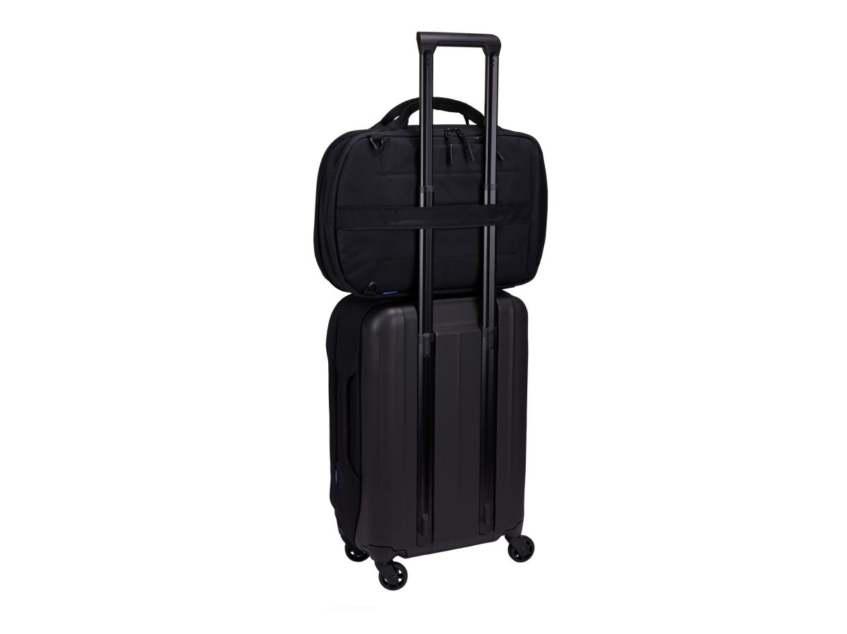 Ako iné tašky/batohy od značky Thule, obsahuje aj táto popruh, pre bezpečné prirobenie k teleskopickej rukoväte batožinu na kolieskach, pre pohodlie počas cestovania.