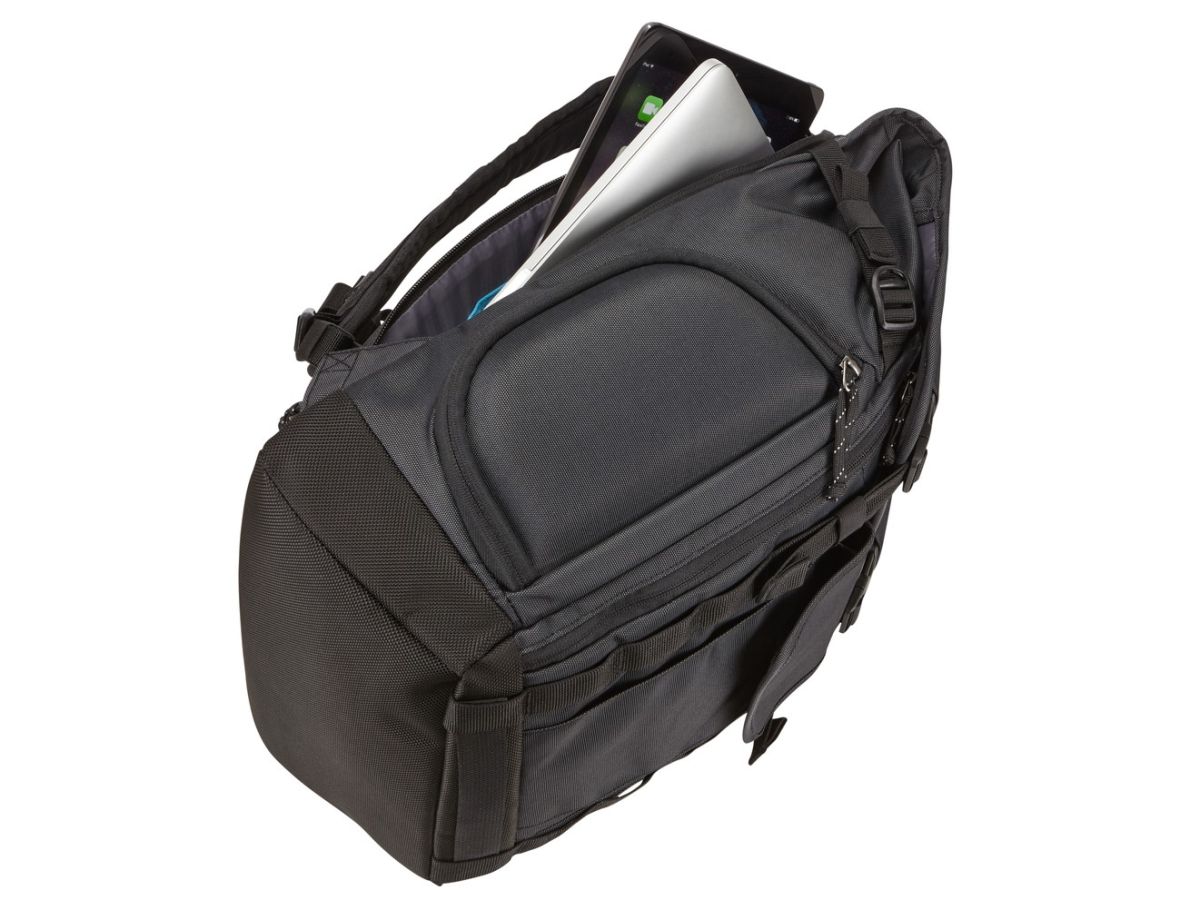 V hlavnom oddiele, ktorý má klopové uzatváranie, nájdete polstrované vrecká pre bezpečné uloženie 15'' MacBooku, tabletu a drobnej elektroniky. Tiež je tu dostatok priestoru pre ďalšie veci. Notebook je chránený polstrovanou konštrukciou SafeEdge.