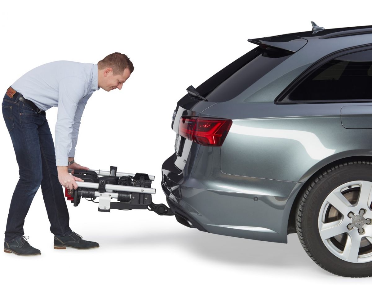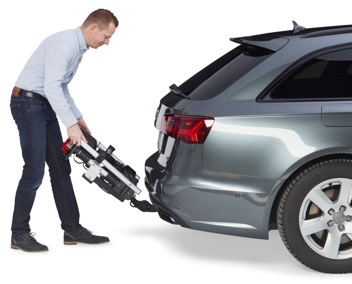 - Montáž nosiča na ťažné zariadenie: sklopenie nosiča