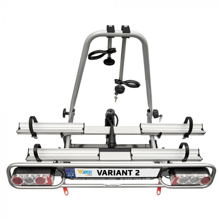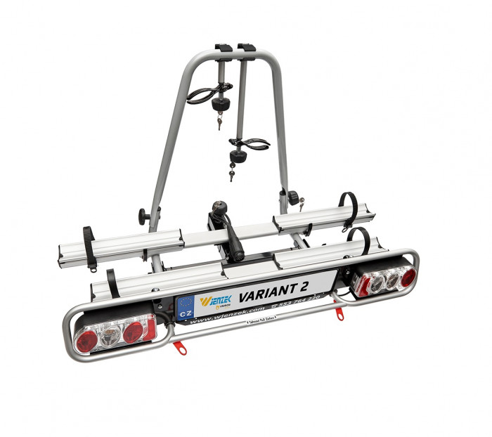 Český výrobok Wjenzek Variant 2 je nosič na ťažné zariadenie pre 2 bicykle. Model Variant bol konštruovaný s ohľadom na vysokú mieru bezpečnosti a praktickosť pri používaní. Držiak sa pripevní k ťažnému zariadeniu pomocou zvislej skrutky, ktorá sa utiahne priloženým kľúčom, čím je zaistená pevnosť spoja medzi nosičom Wjenzek a TZ na aute. Nosič Wjenzek Variant je vybavený spodnou aretačnou skrutkou, ktorá zaisťuje sklon držiaka a Vy sa tak nemusíte obávať o nesprávne zaistenie nosiča pri jazde. Nosič Wjenzek Variant je robustná konštrukcia z pevnej ocele čím zaisťuje vysokú bezpečnosť pri preprave bicyklov.